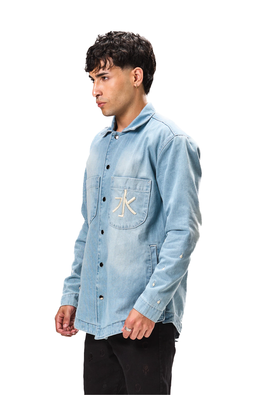 El cuello solapa aporta elegancia, mientras que los bolsillos frontales refuerzan su funcionalidad sin perder pureza estética. Los bordados —presentes en el frente y las mangas— retratan uno de los elementos mas puros de la naturaleza, el agua, que evoca un símbolo de pureza y transformación en la cultura japonesa.